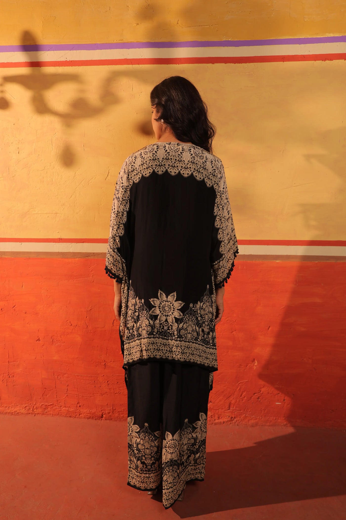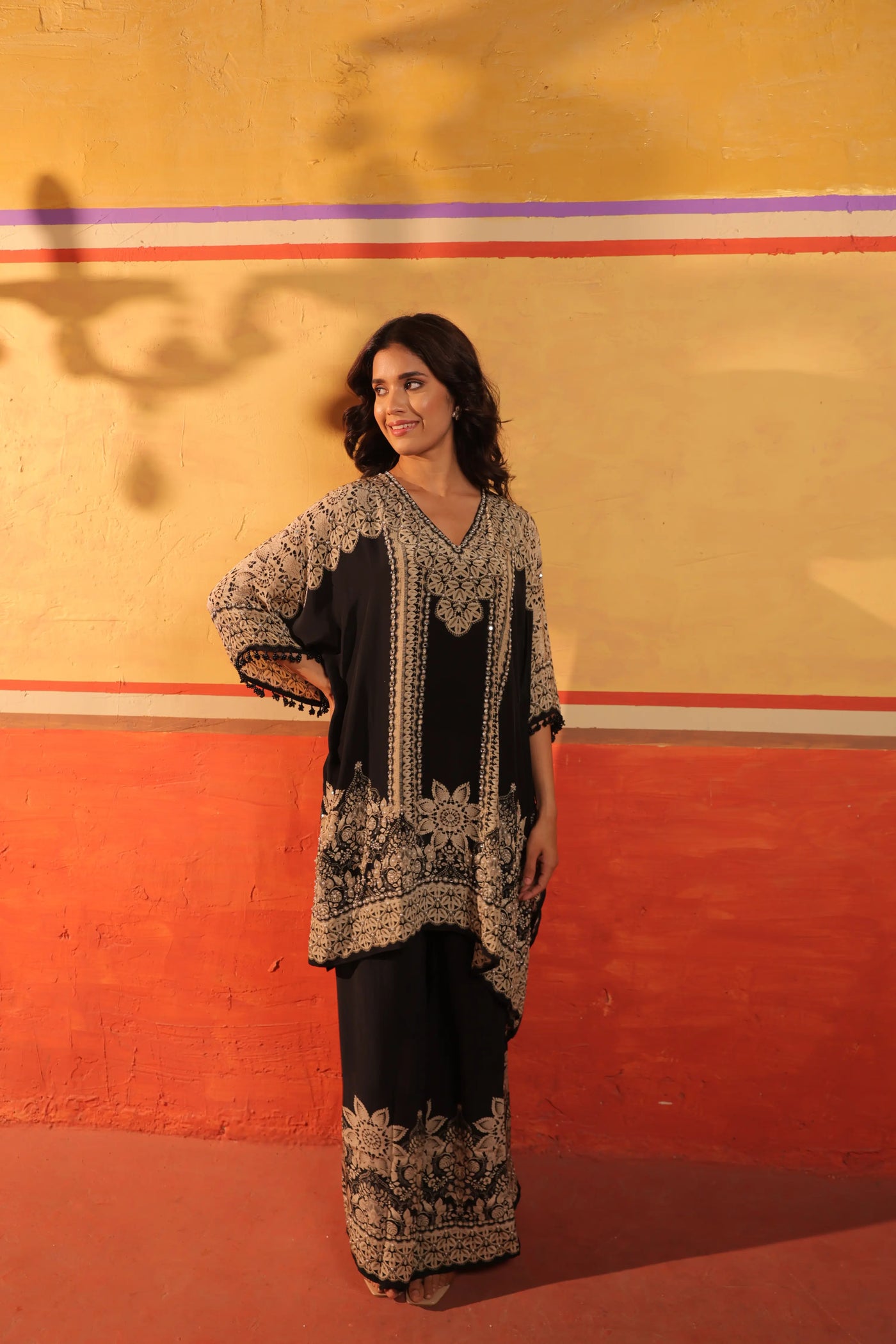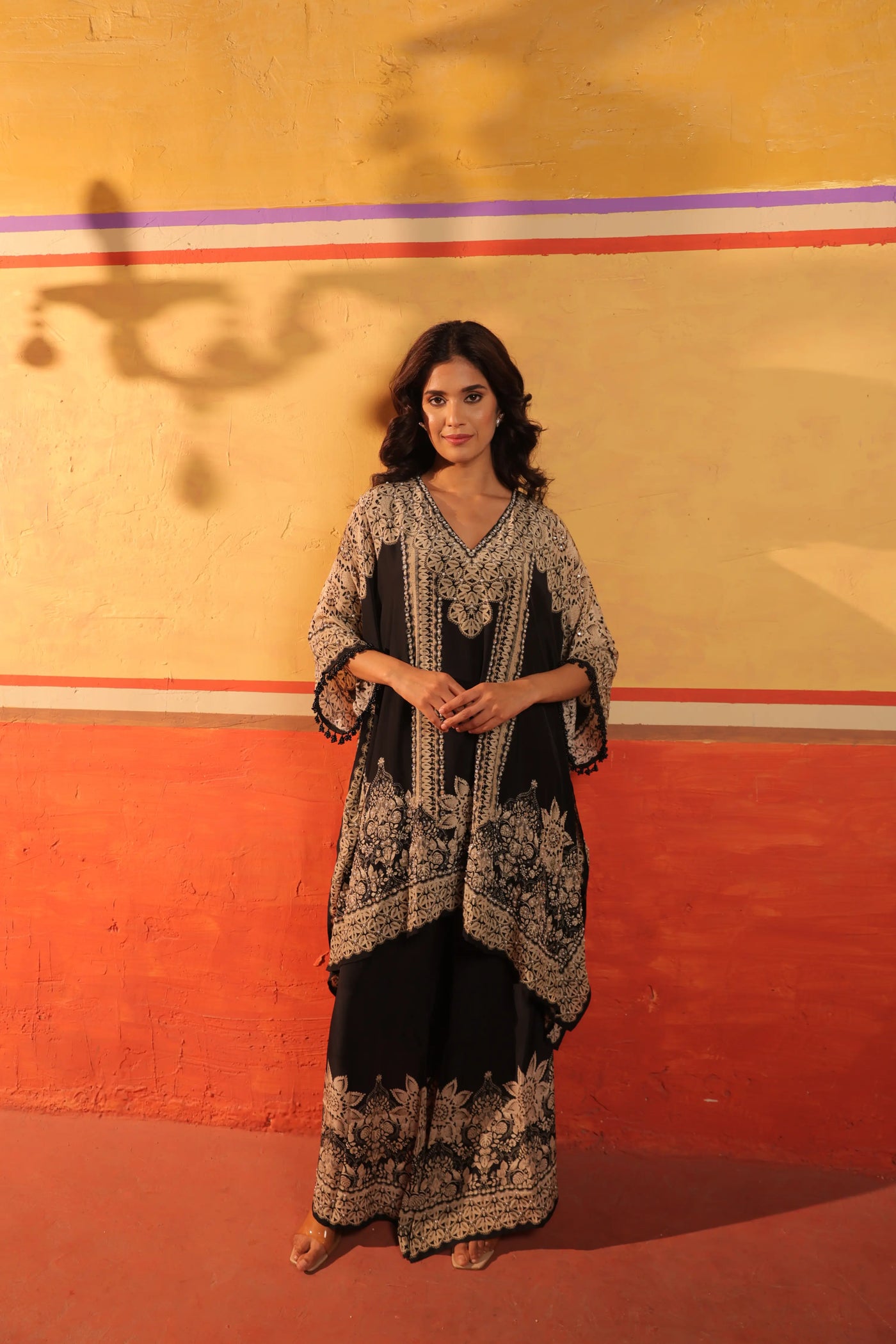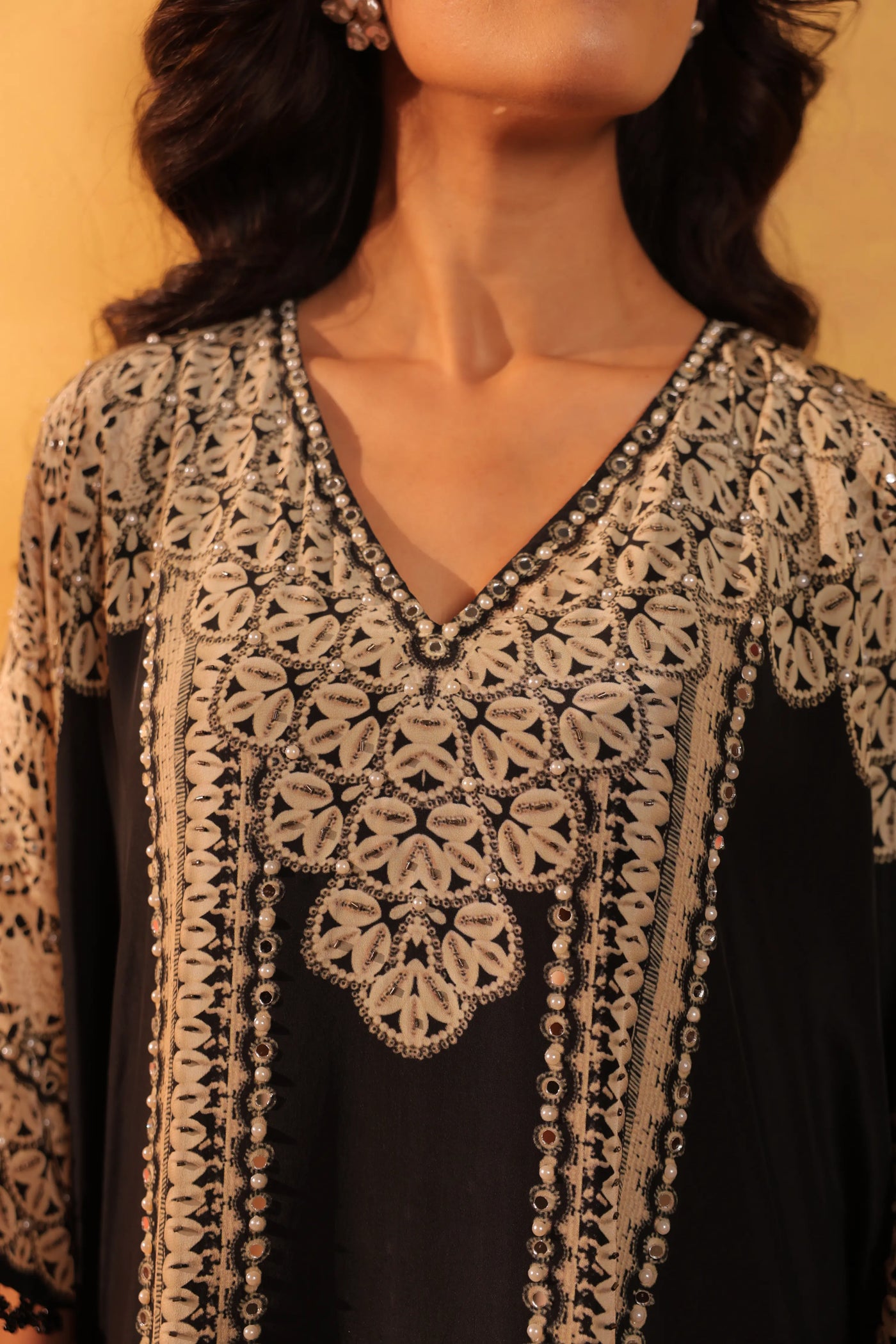 The Pandora Kaftan Set is a sleek and sophisticated set crafted from luxurious crepe fabric. This ensemble includes a kaftan with pants, perfect for making a statement at formal events or special occasions.