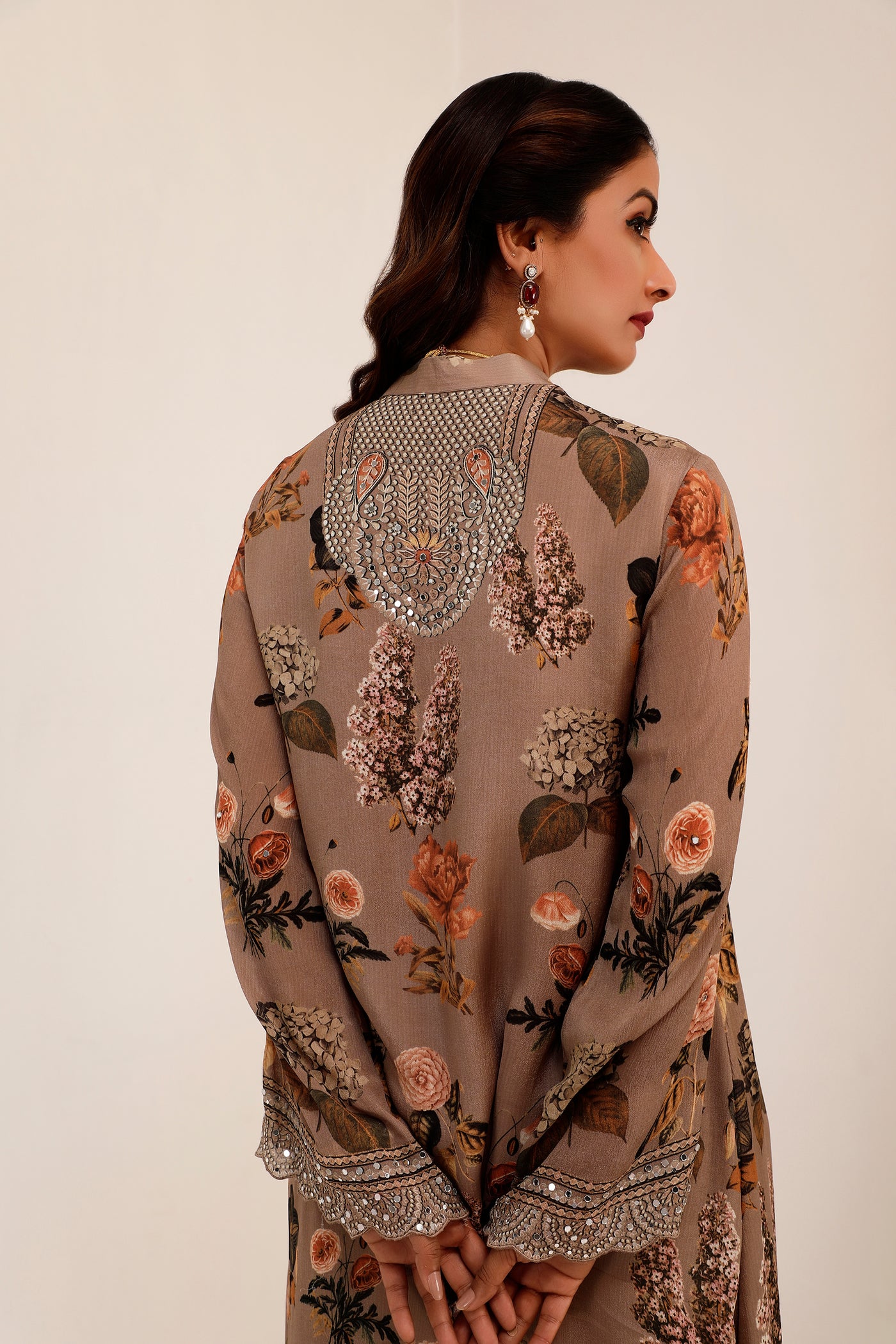 This A-line kurta set ensures the every women feels like a timeless masterpiece Crafted with Crepe and dominated by a unique Judge Gray color, decorated with floral prints and exquisite mirror work inspired by traditional Lippan art from Kutch. It is paired with Palazzo.