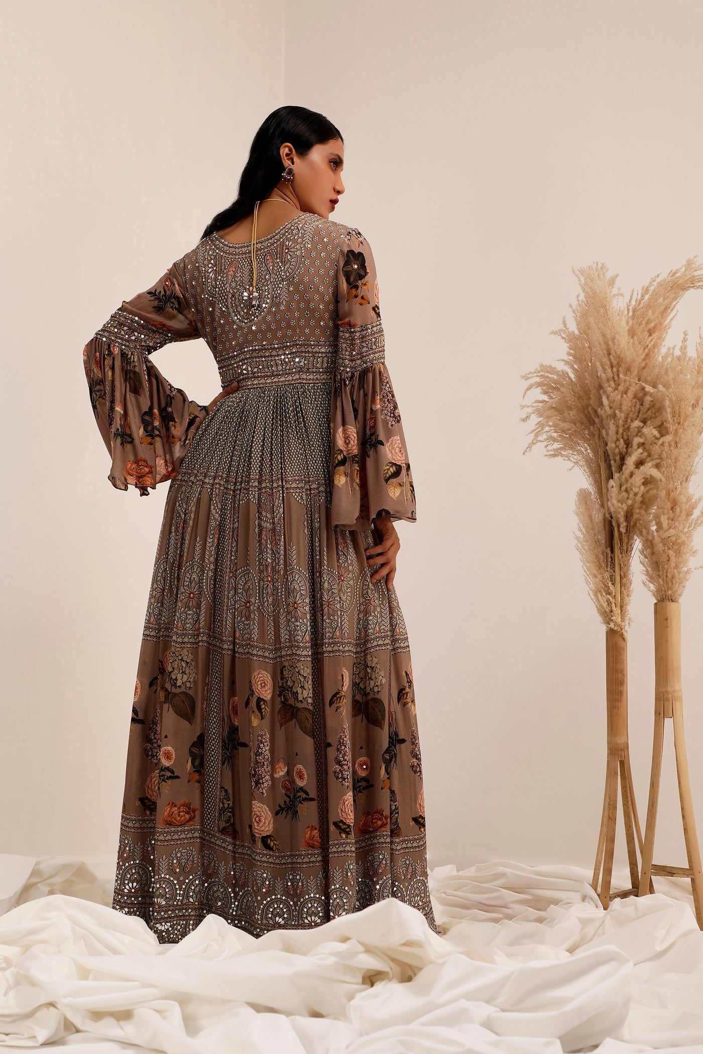 This Anarkali ensures the every women feels like a timeless masterpiece Crafted with Crepe and dominated by a unique Judge Gray color, decorated with floral prints and exquisite mirror work inspired by traditional Lippan art from Kutch.