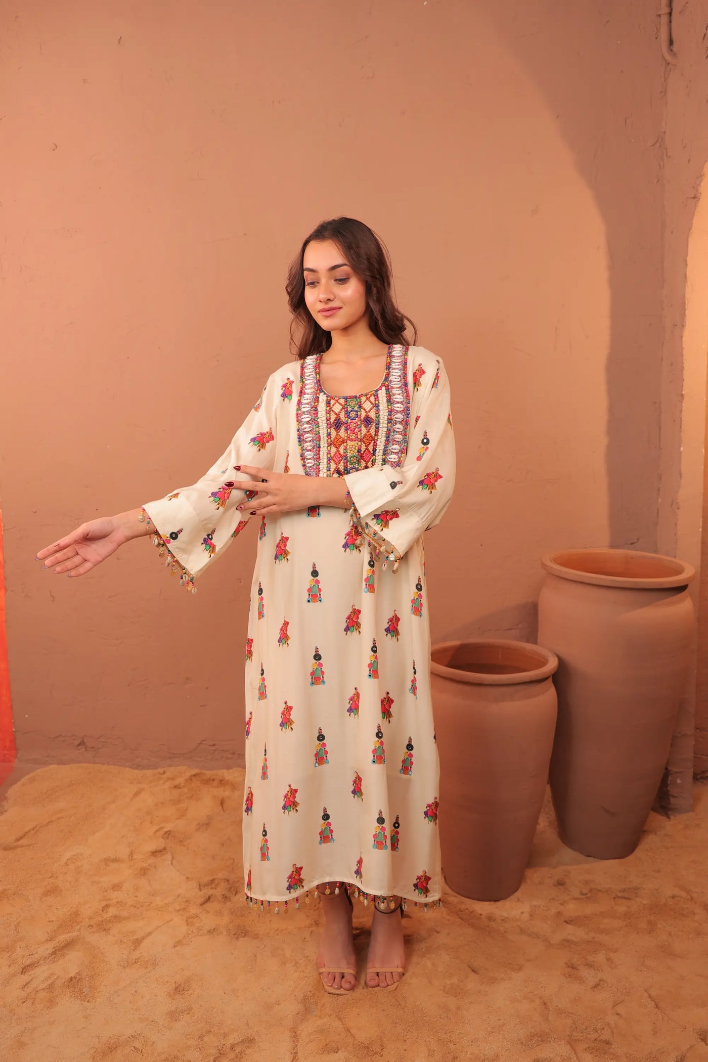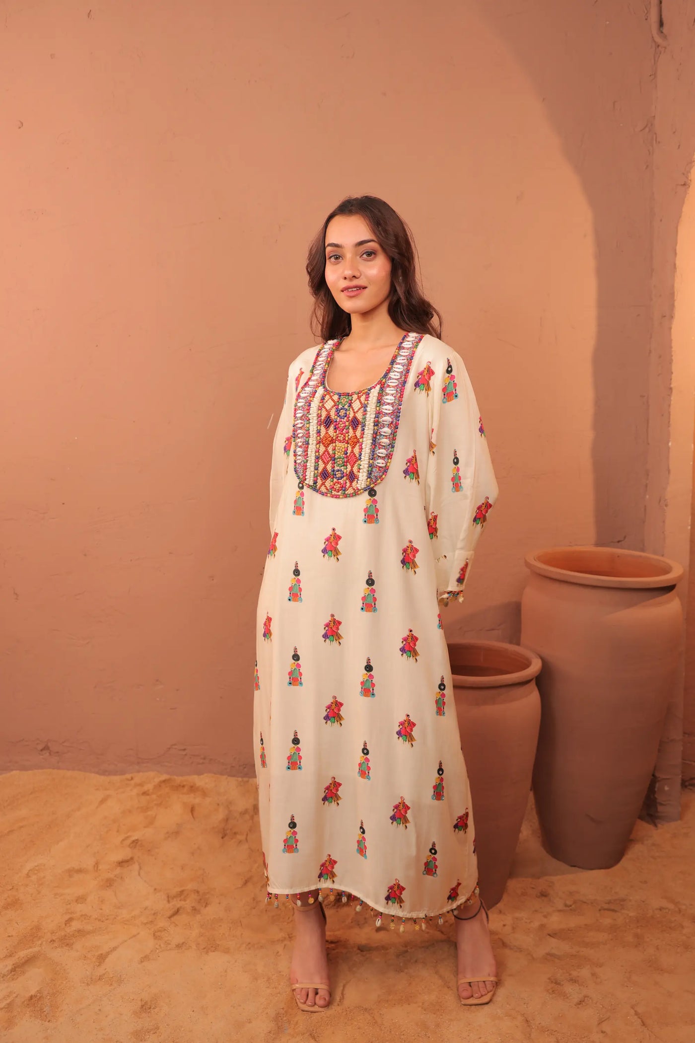 The Albeli dress exudes elegance with its off-white cotton muslin ensemble, beautifully accented with bold motifs.