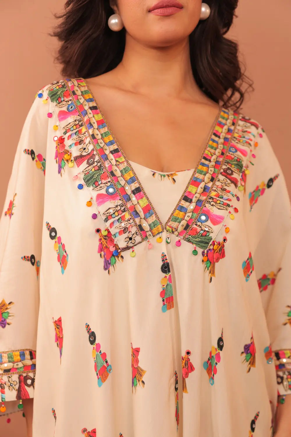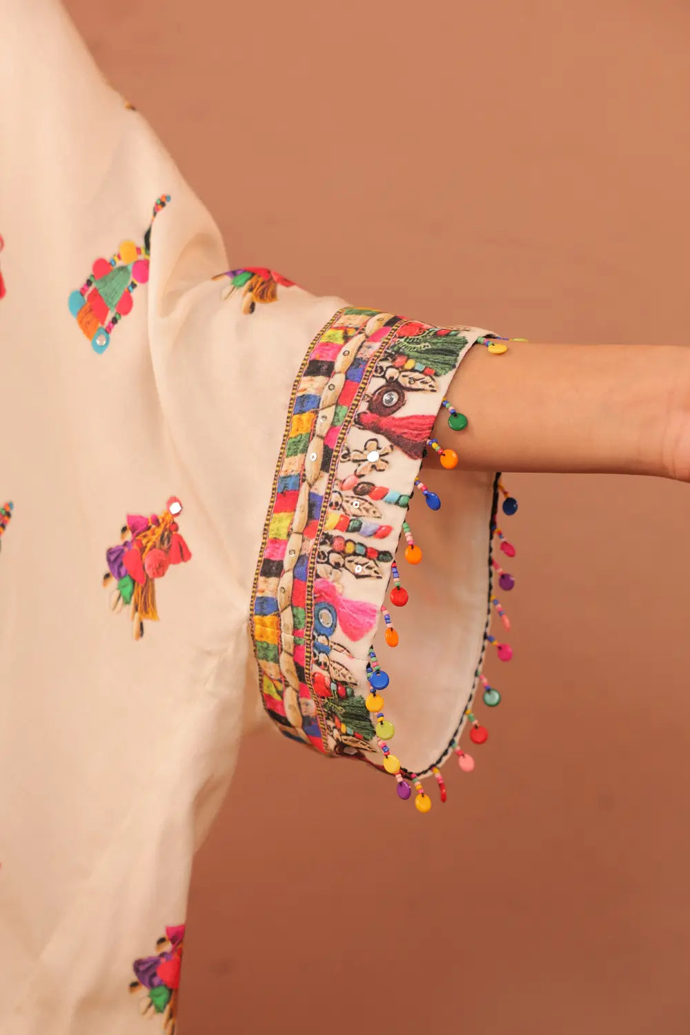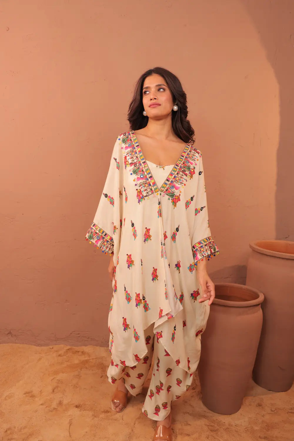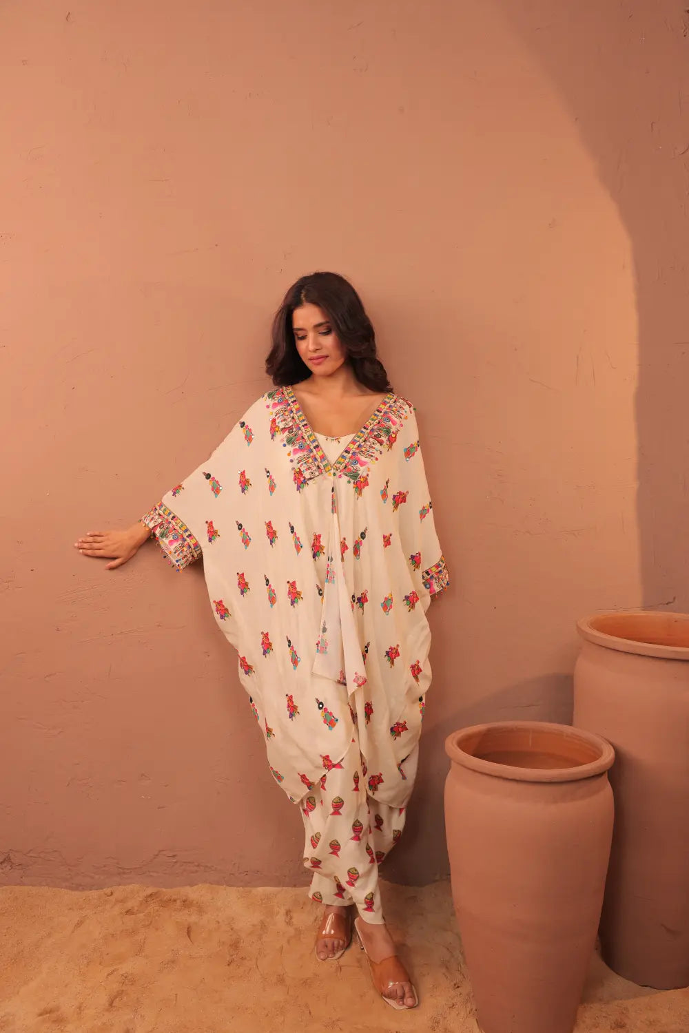 The Albeli jacket Set exudes elegance with its off-white cotton muslin ensemble, comprising a flowing jacket and dhoti pants, beautifully accented with bold motifs.