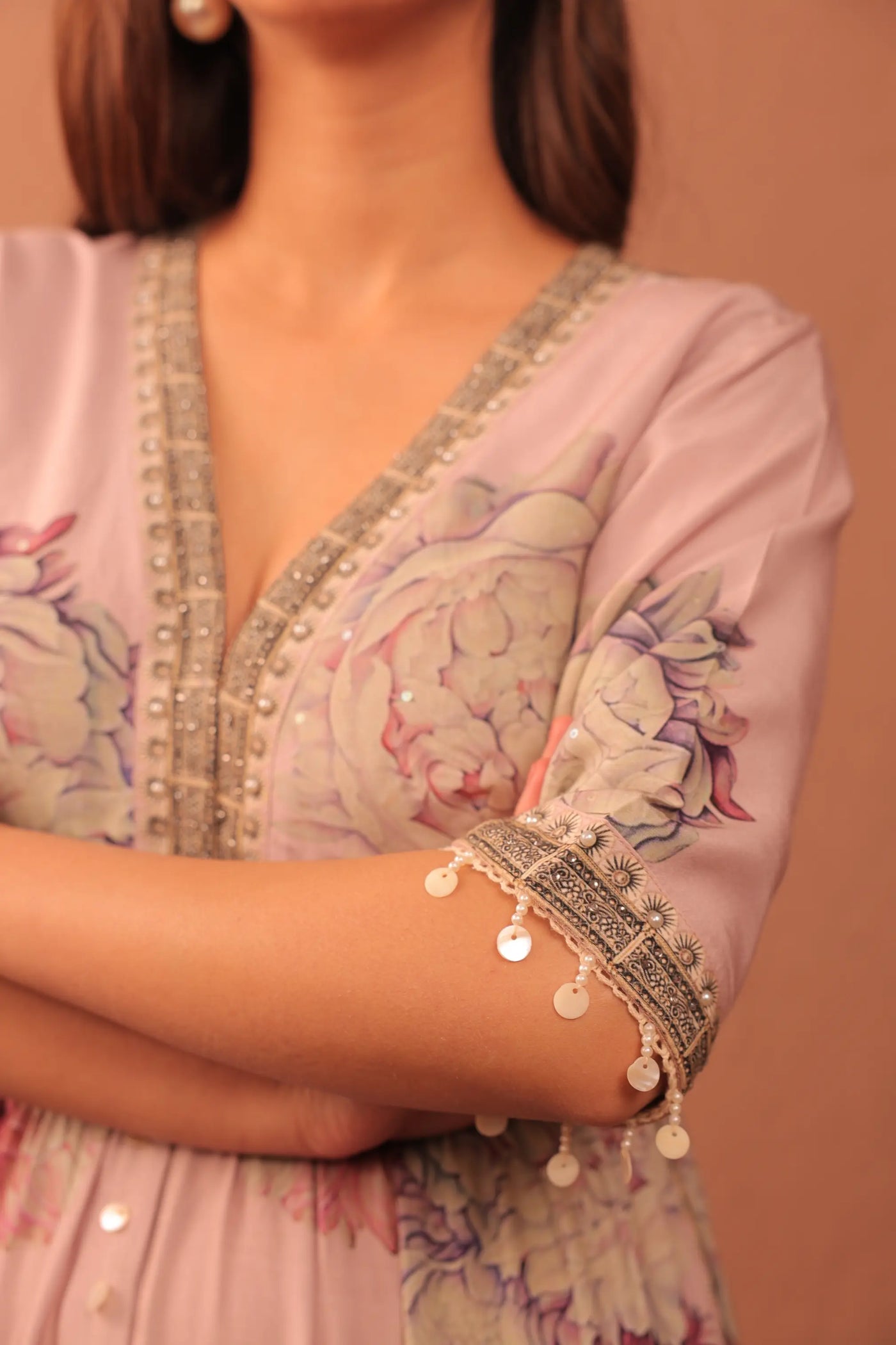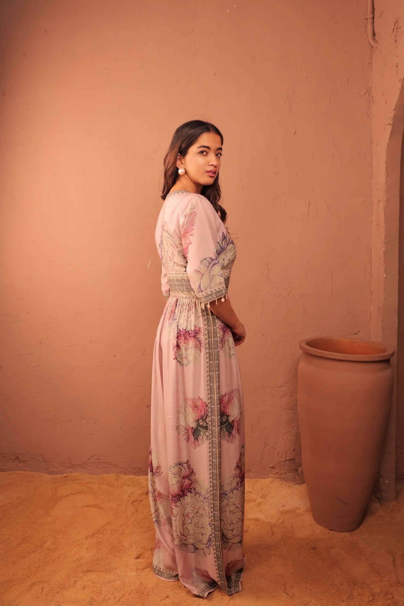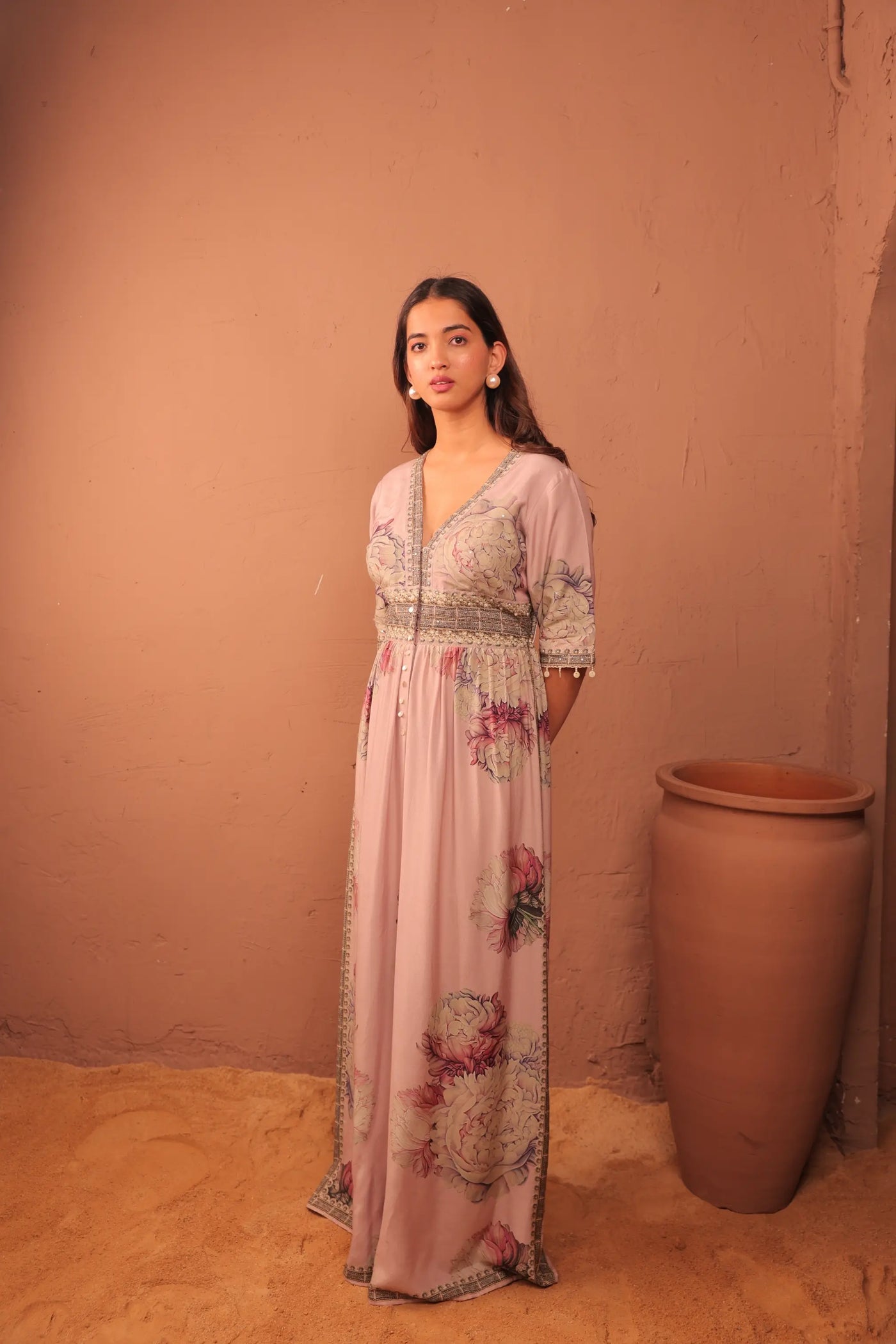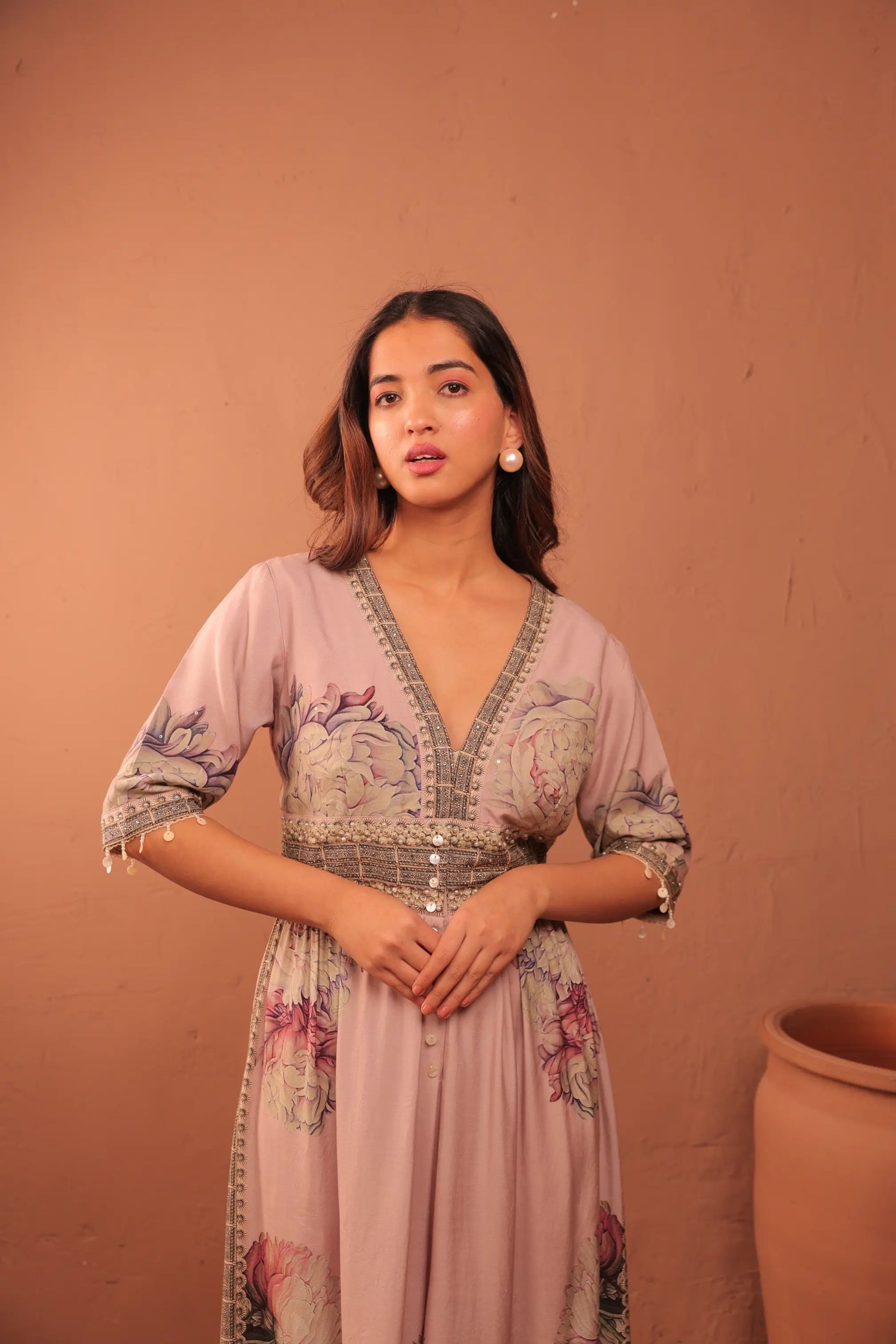 The Carnation Crush Jumpsuit is a romantic ensemble inspired by mauve-hued carnation flowers. This jumpsuit is crafted from lightweight cotton muslin fabric.