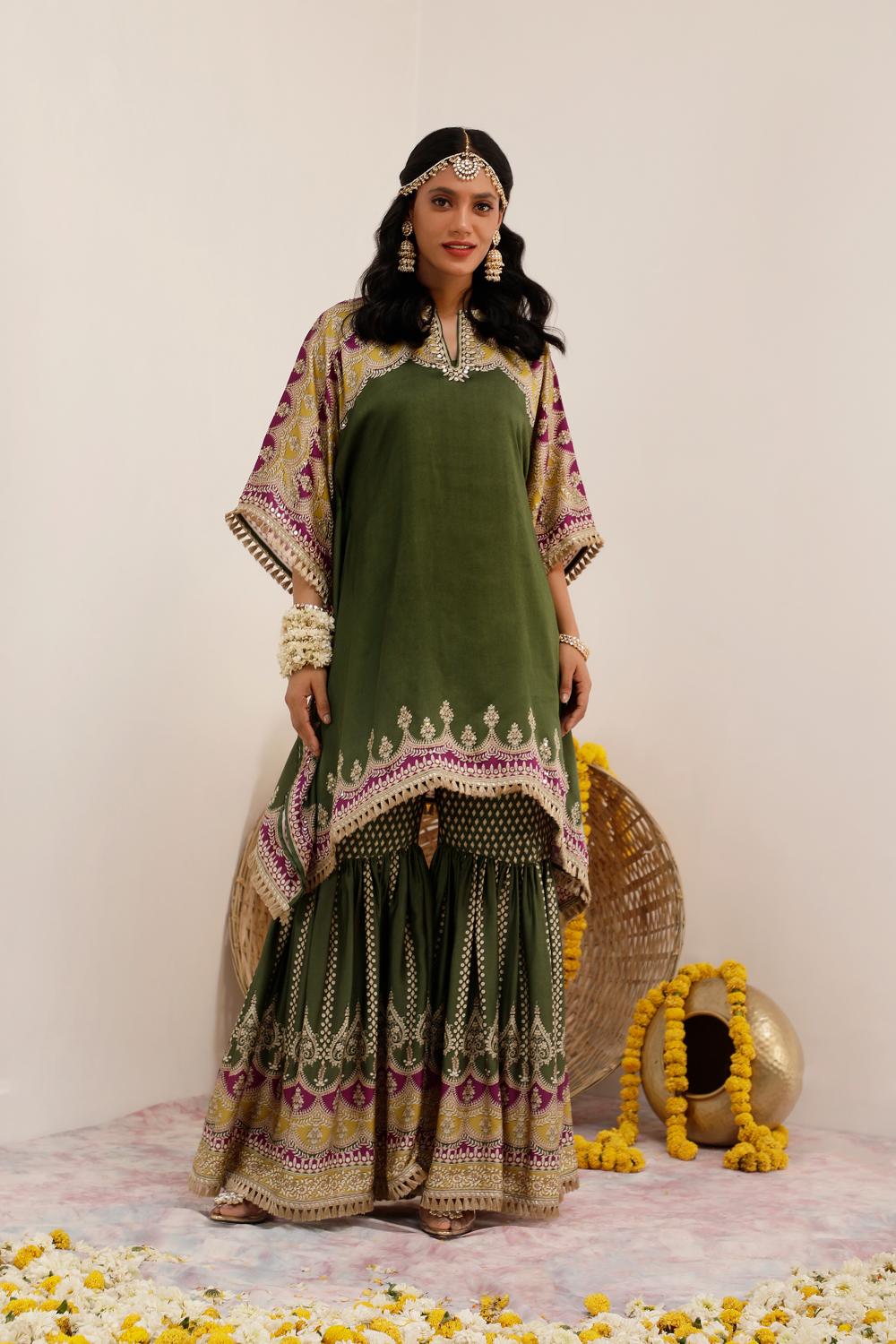 Noor Kaftan set beautifully marries the essence of traditional Indian aesthetics with mordern silhouttes. Featuring rich olive green hues and intricate printed detailings on Crepe. The motifs tells a story of tradition, while touch of wine and mustard color adds vibrancy to it. This set includes Kaftaan, Garara and sltp.