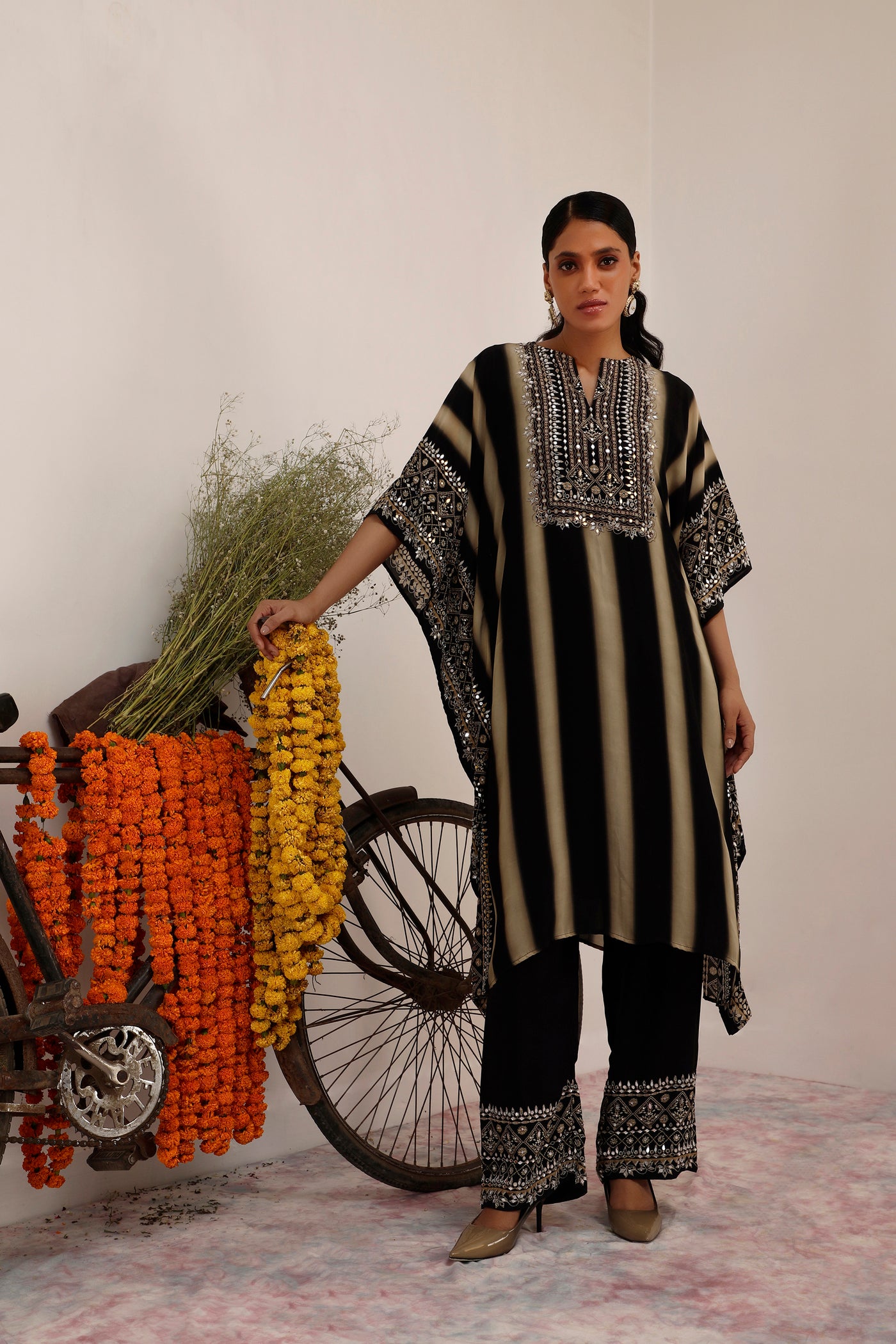 सलमा-सितारा Kaftan set masterfully blends traditional motifs with contemporary fashion elements. Entirely crafted with Crepe fabric. Showcasing deep black canvas with strips of Beige color. It is paired with Pants, Slip and Potli.