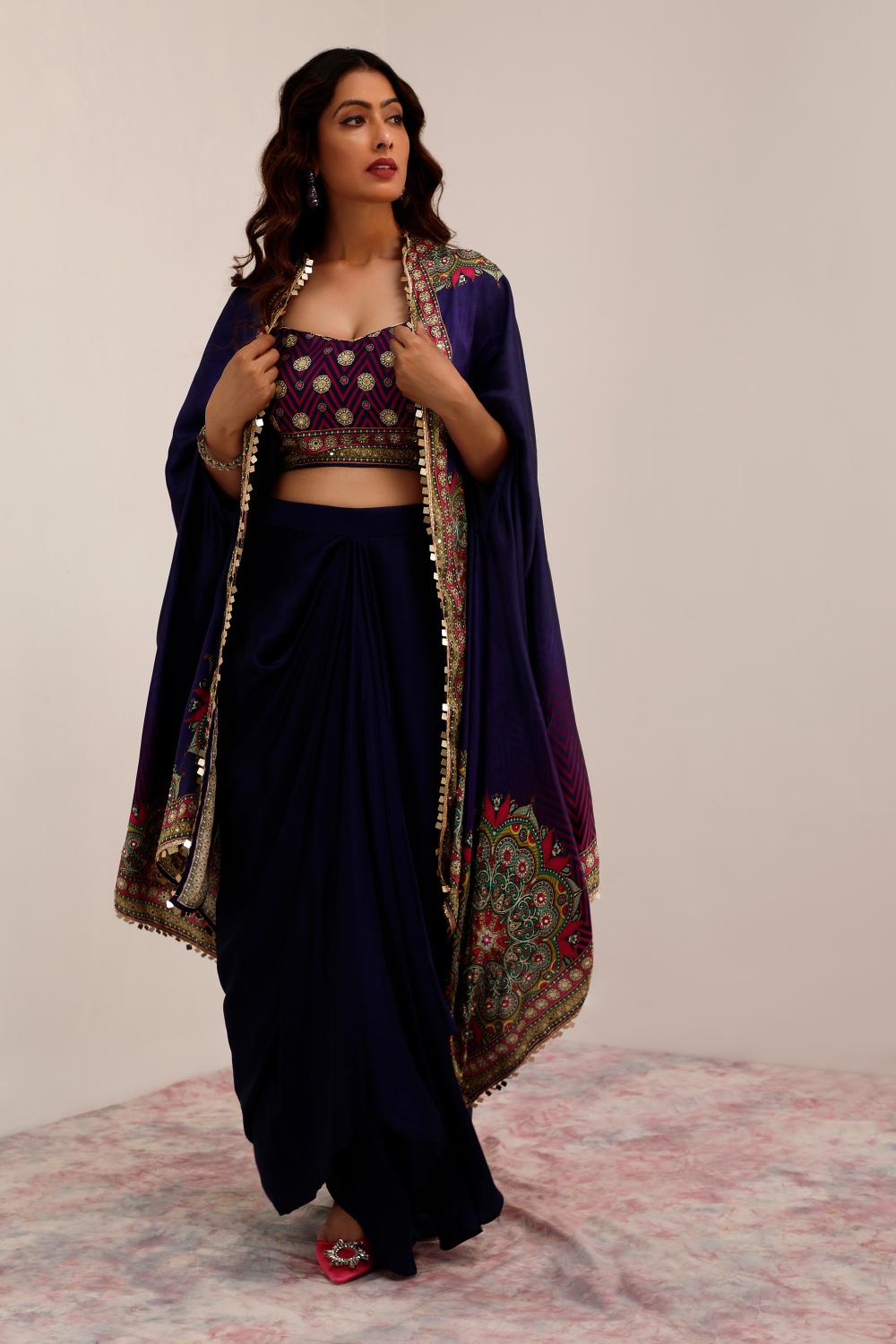with mandala art.This set includes Cape, Blouse and Draped skirt.