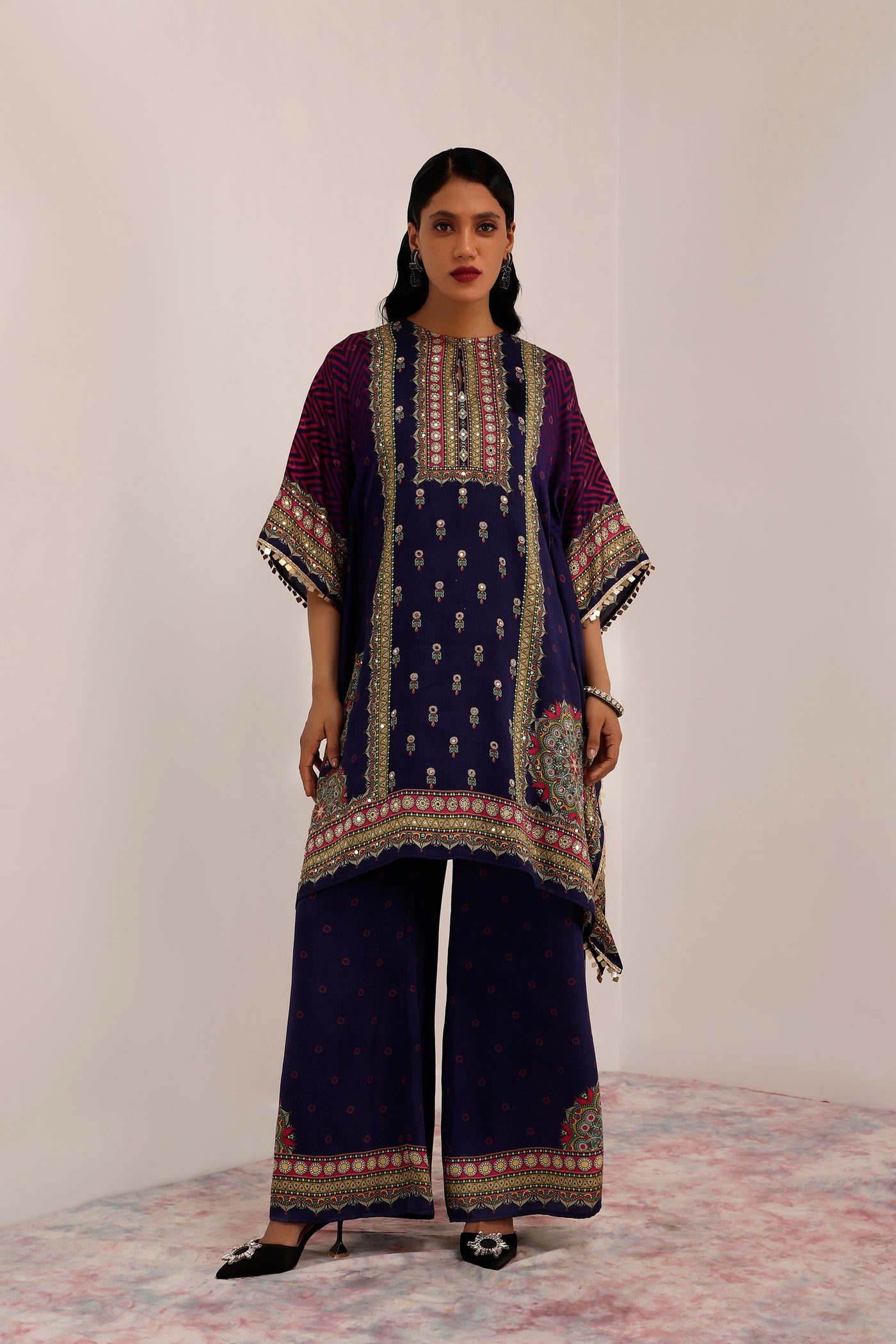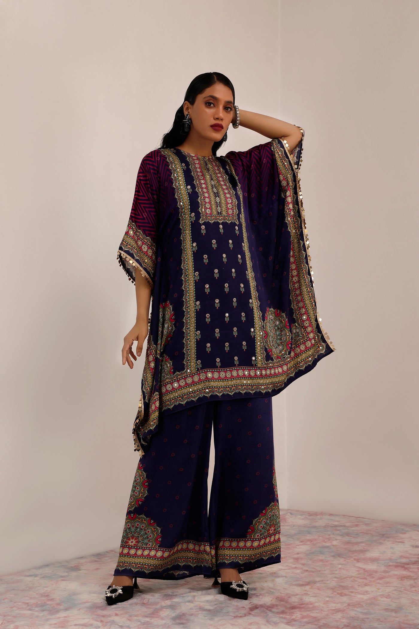 Kaashni Kaftan set encapsulates the essence of traditional and contemporary elements into harmonious collection. Rich hues of indigo and purple dominates the pallette, and created with Russian cotton silk. Kaashni has a profound connection with mandala art.This set includes Kaftaan, Palazzo and Slip